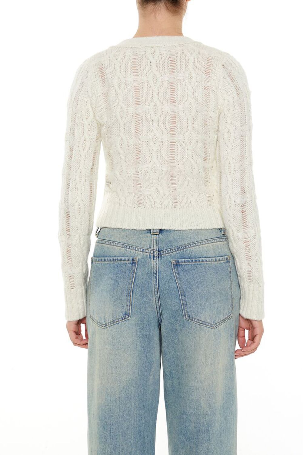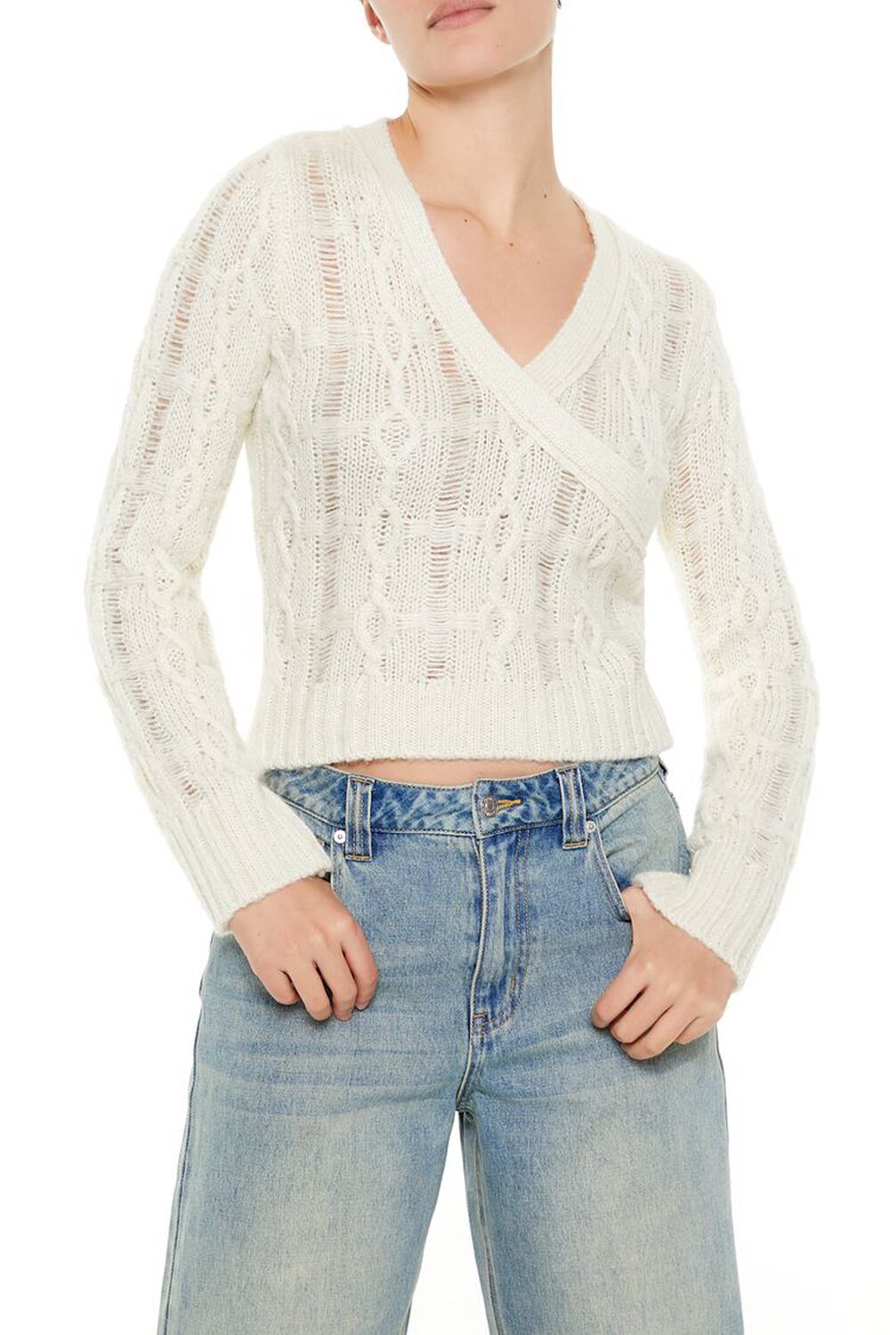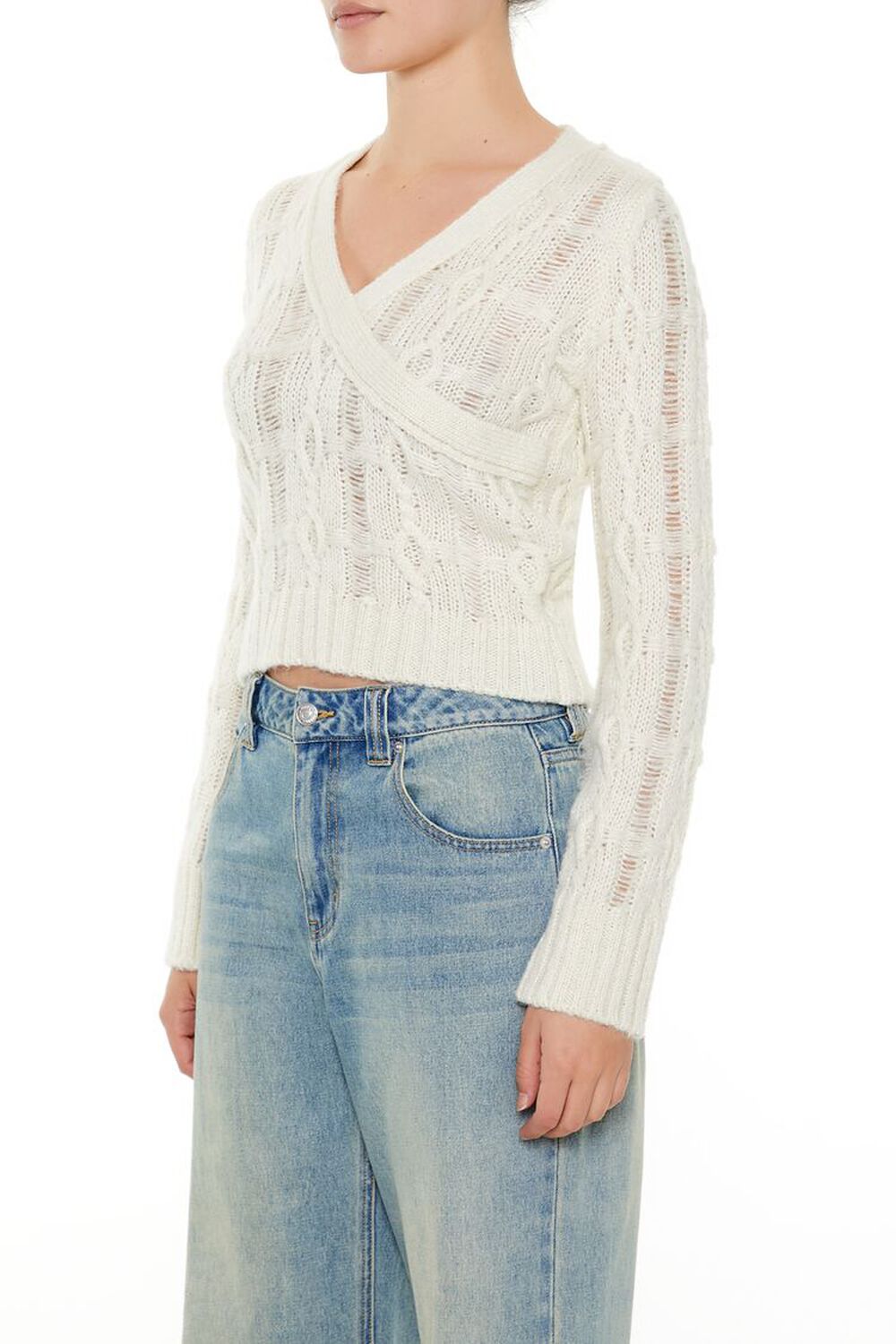 A lightweight cable knit sweater featuring a crossover design, surplice neckline, long sleeves, ribbed trim, and a cropped hem.