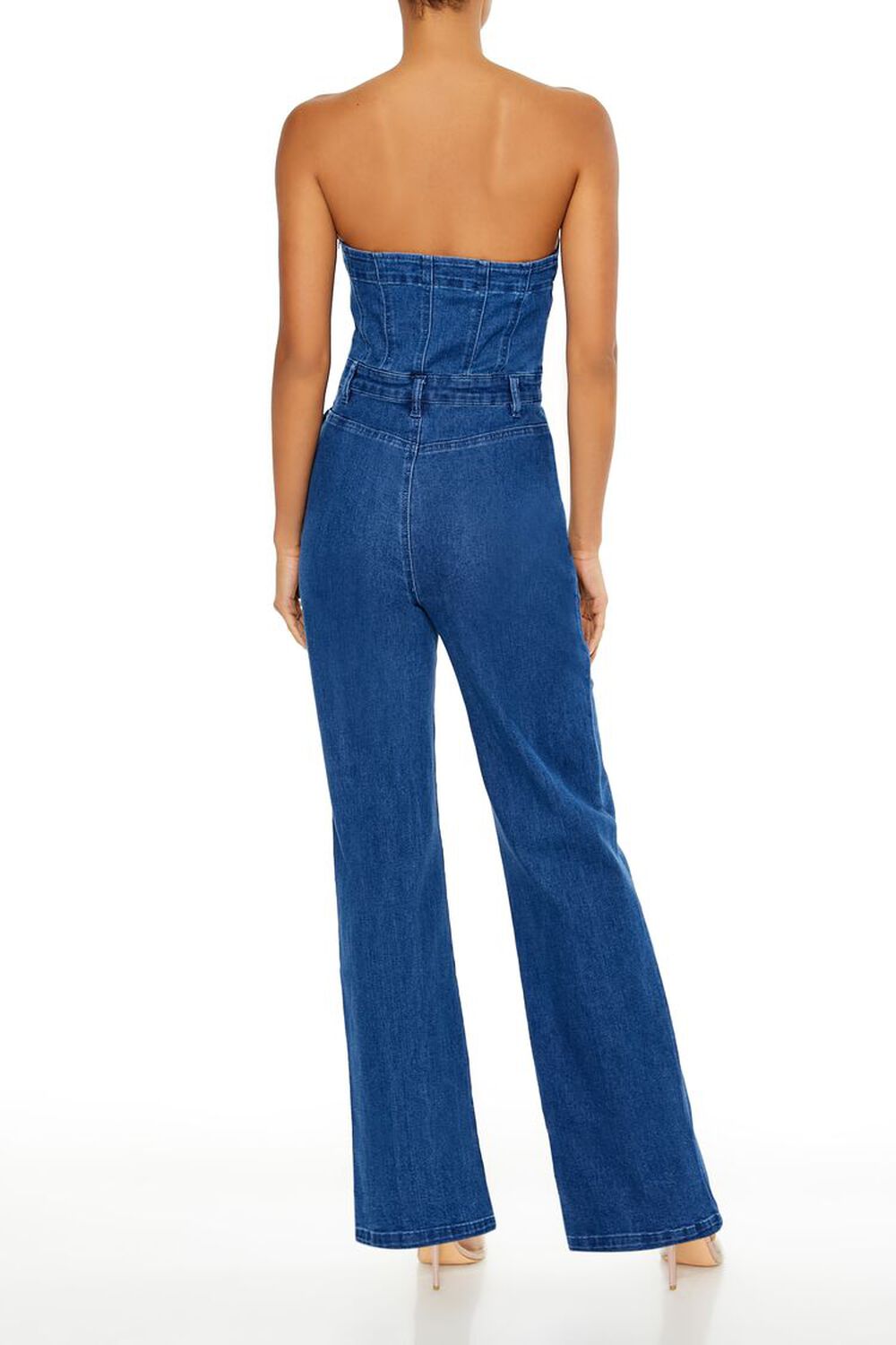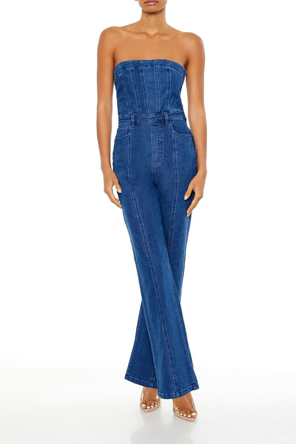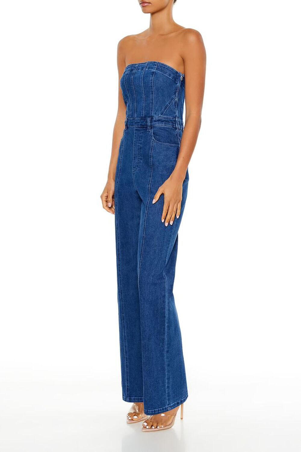 Crafted from non-stretch denim, this jumpsuit features a straight-cut neckline and back, seam detailing, belt loops, front slant pockets, side zipper, and a straight leg.