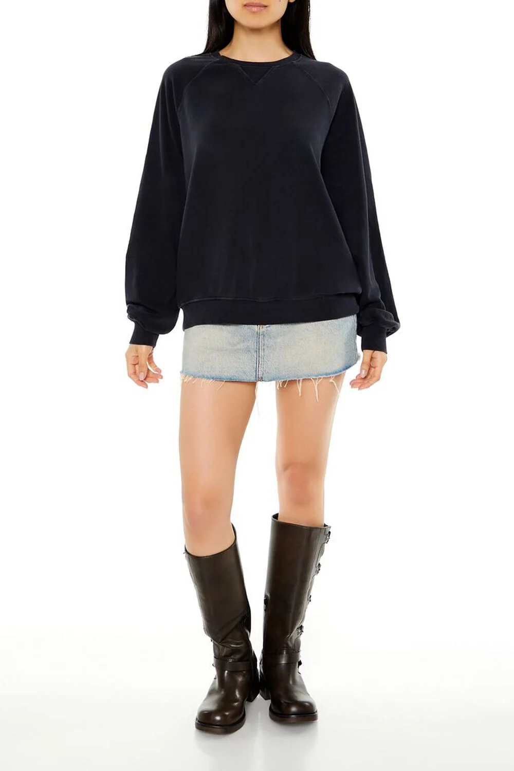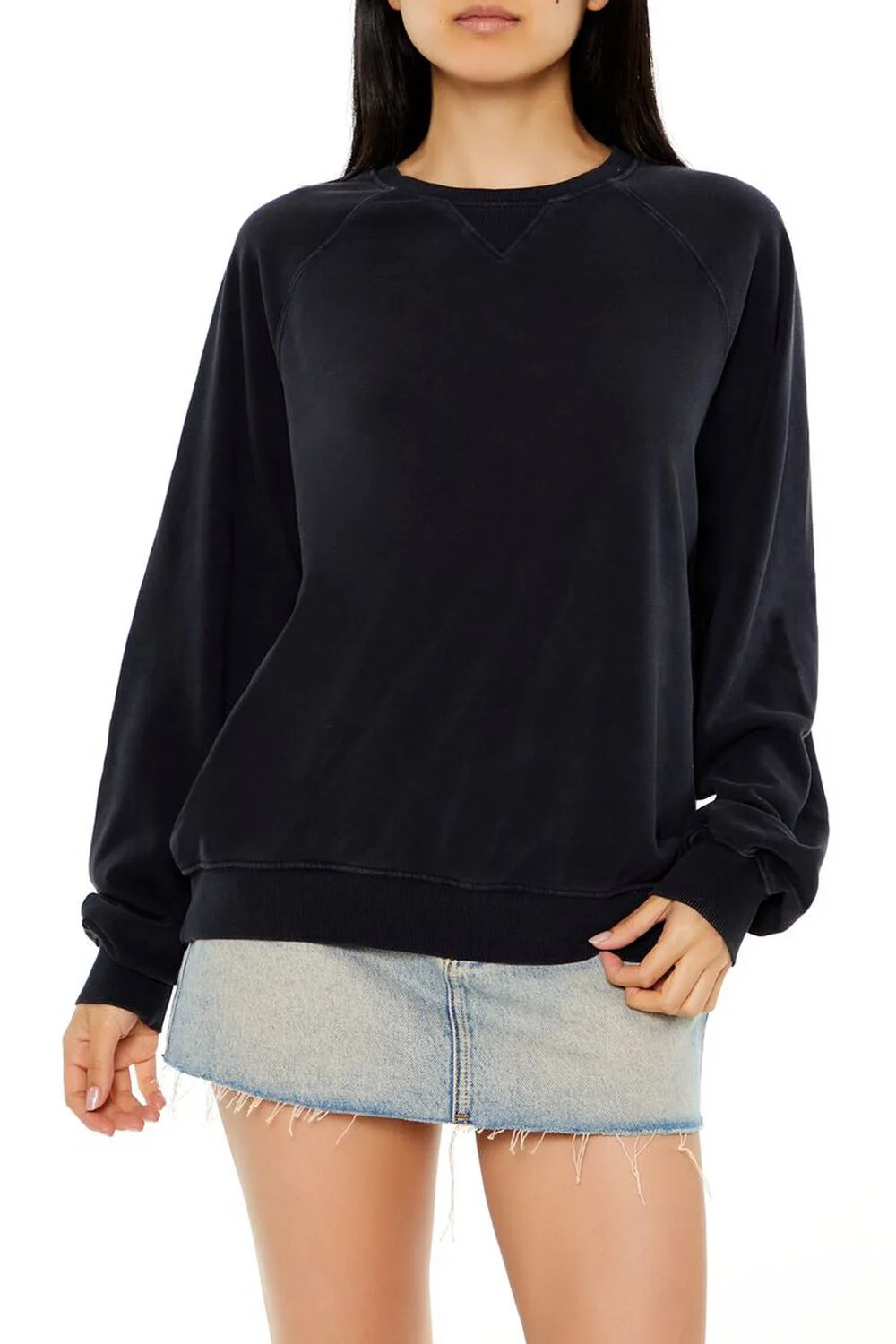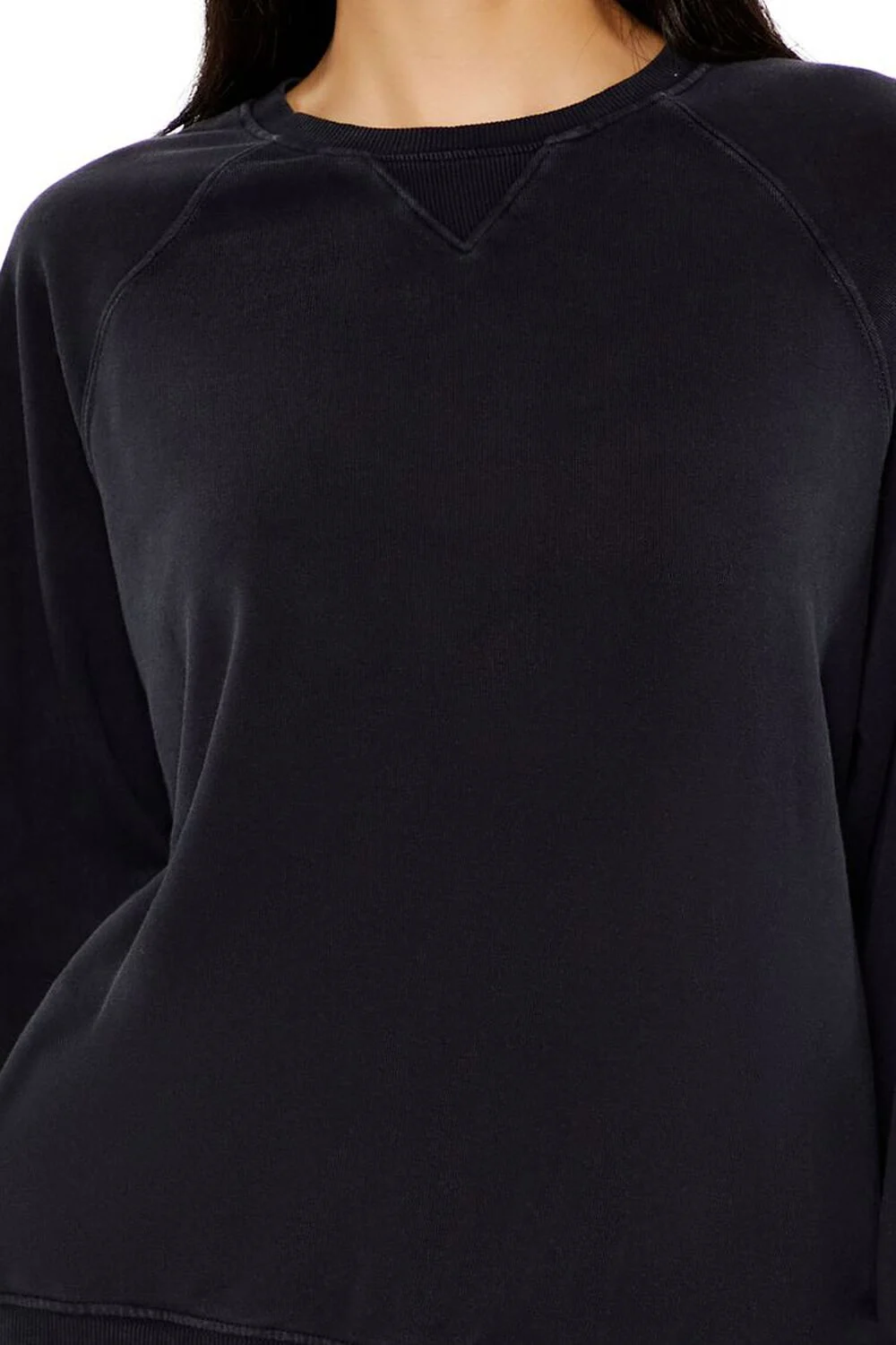 A French terry pullover featuring long raglan sleeves, ribbed trim, a crew neck, and front V-notch stitch.