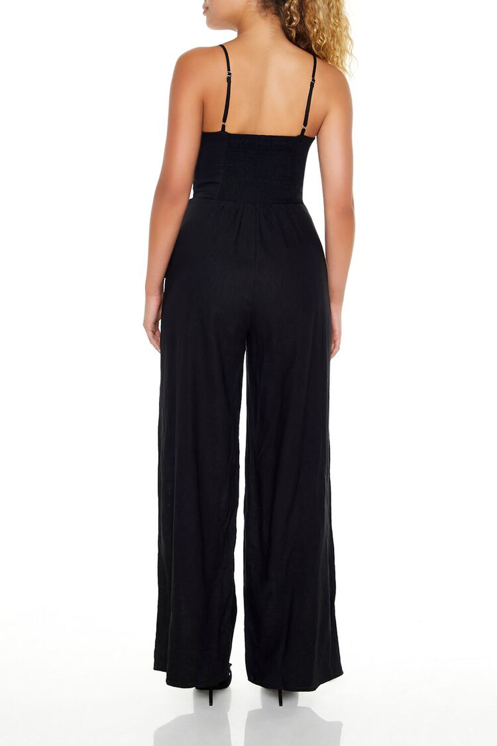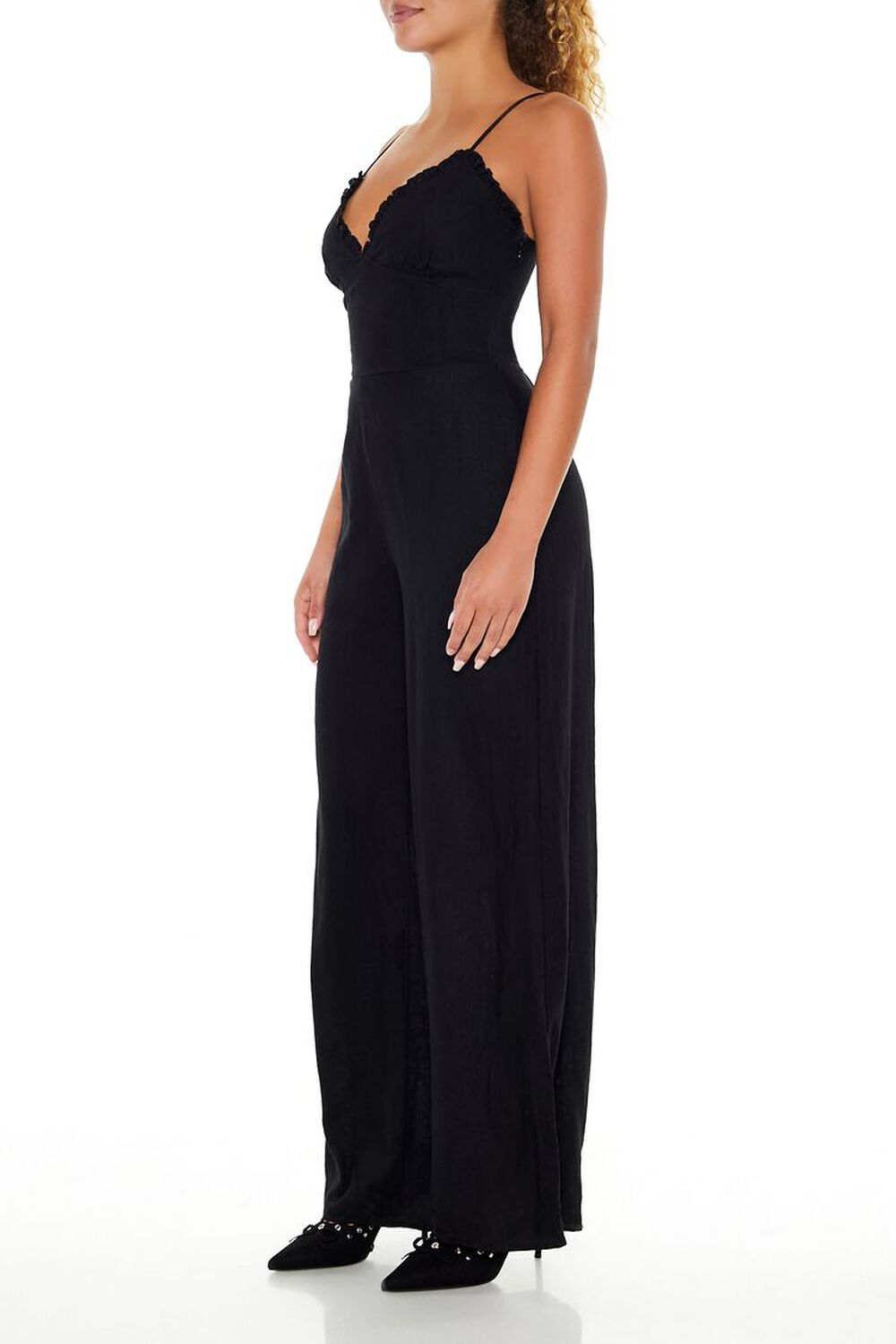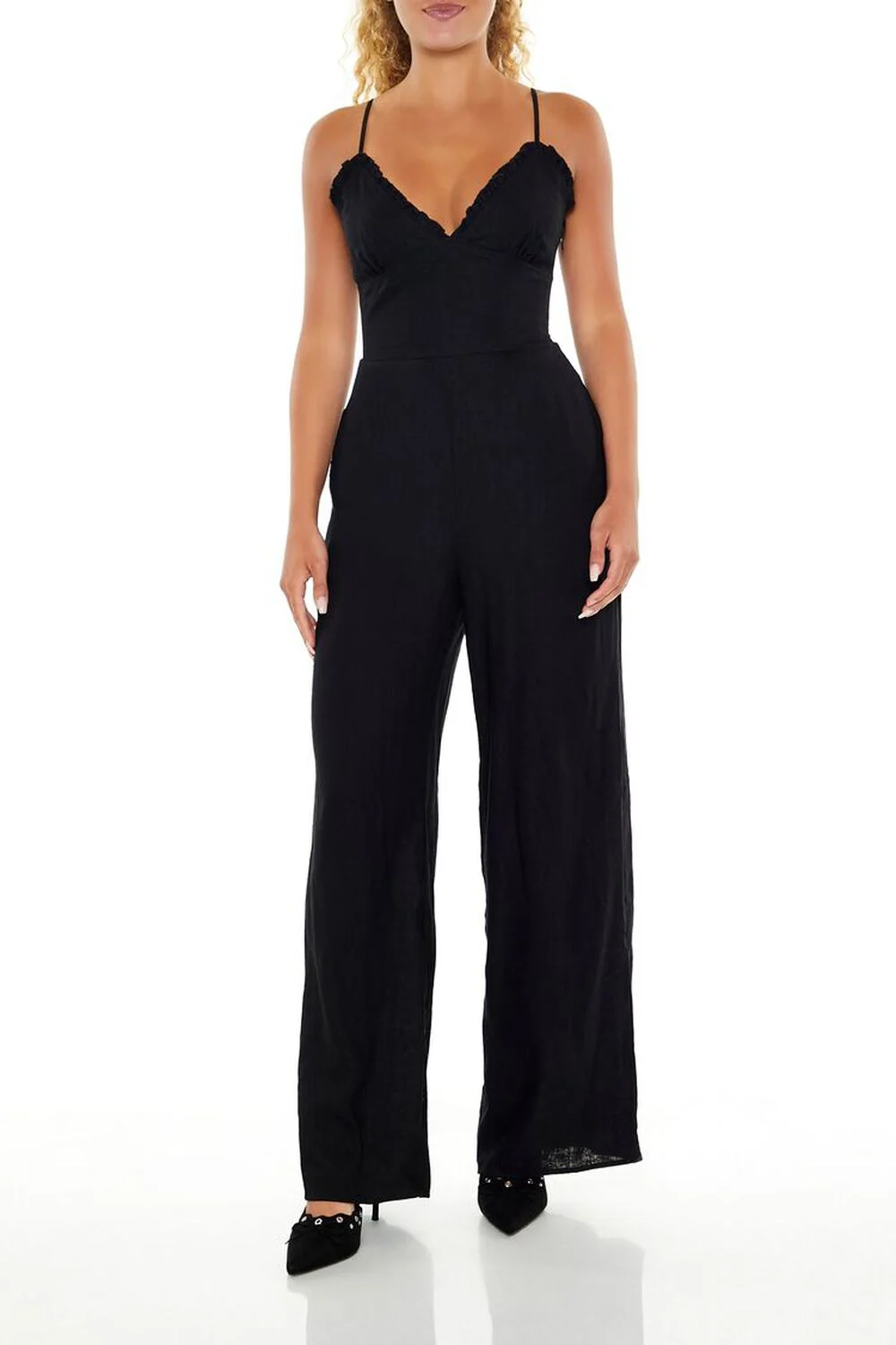 A woven jumpsuit featuring a gauzy construction, ruffle trim, plunging neckline, adjustable cami straps, straight-cut back with smocked panel, concealed zipper side closure, on-seam pockets, and a wide leg.